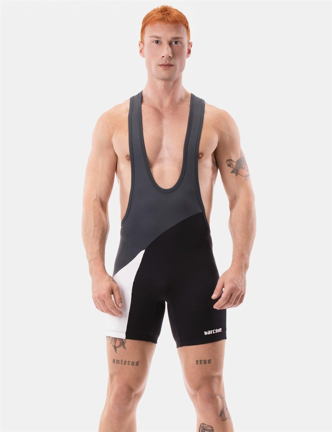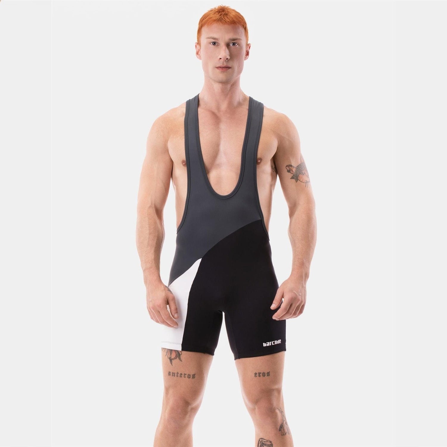 Singlet made of inserts for a colorful wrestling suit look, and contrast finishing tape.